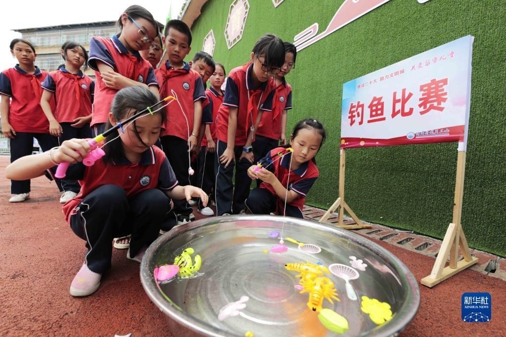 5月30日,貴州省錦屏縣城關(guān)第三小學(xué)學(xué)生在參加釣魚(yú)比賽。 新華社發(fā)(楊曉海攝)