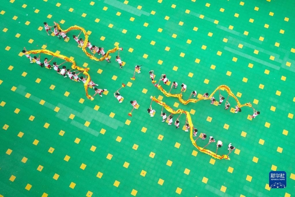 5月30日,在河北省唐山市豐潤(rùn)區(qū)左家塢鎮(zhèn)中心幼兒園,孩子們?cè)诒硌菸椠埞?jié)目(無(wú)人機(jī)照片)。 新華社發(fā)(朱大勇攝)