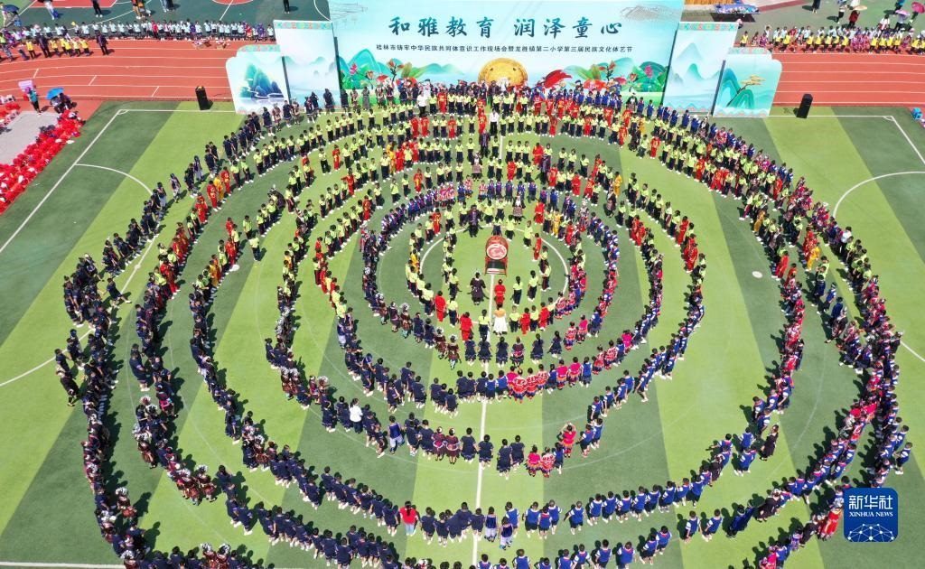 5月30日,在廣西桂林市龍勝各族自治縣龍勝鎮(zhèn)第二小學(xué),師生在跳團(tuán)圓舞(無(wú)人機(jī)照片)。 新華社發(fā)(潘志祥攝)