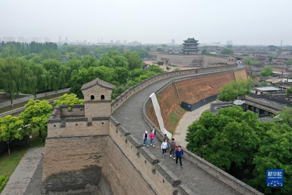 游客在平遙古城城墻上游覽(5月30日攝,無(wú)人機(jī)照片)。