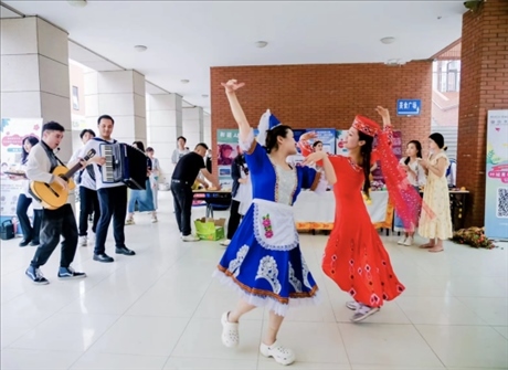5月31日,“石榴籽 祖國(guó)行”新疆大學(xué)代表團(tuán)來(lái)到南開(kāi)大學(xué)。在故事分享會(huì)上,王彥臣、李姝洋、迪力亞爾·迪力夏提同學(xué)向南開(kāi)大學(xué)青年學(xué)子講述了“斷臂男孩”阿卜杜外力·阿卜杜拉、“黨徽大叔”阿布都加帕爾·猛德和“時(shí)代楷?!崩R尼·巴依卡的故事。在文藝大舞臺(tái)上,新疆大學(xué)代表團(tuán)各民族同學(xué)通過(guò)展示新疆特色舞蹈“木卡姆”、民族器樂(lè)“庫(kù)布孜”,向南開(kāi)大學(xué)師生展現(xiàn)大美新疆熱情好客、能歌善舞的地域特色。