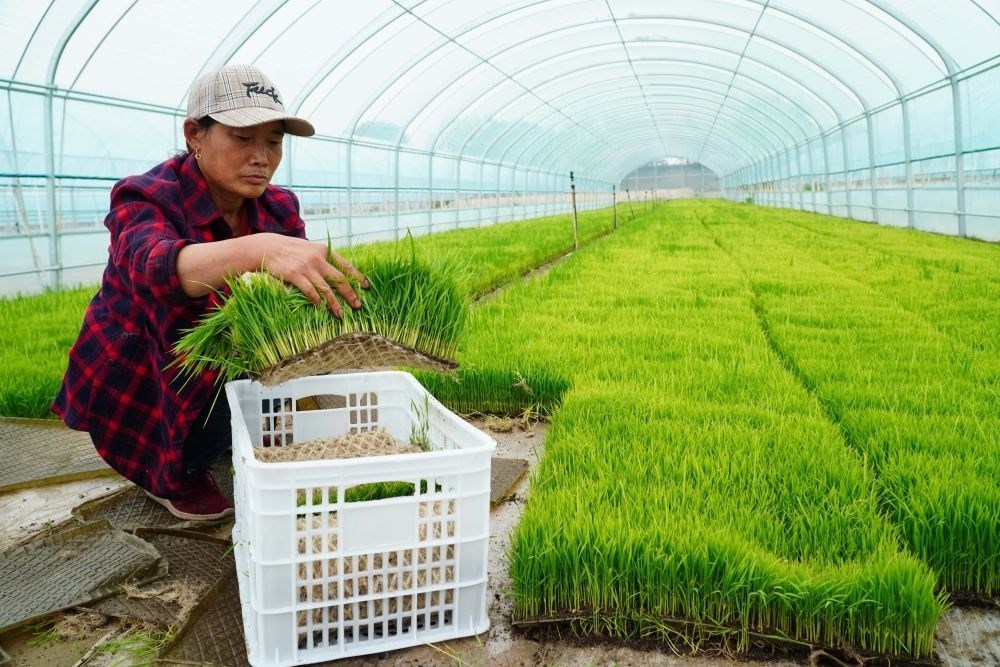 5月20日,山東省東營市墾利區(qū)黃河口鎮(zhèn),農(nóng)戶在培育海水稻秧苗。新華社記者 徐速繪 攝