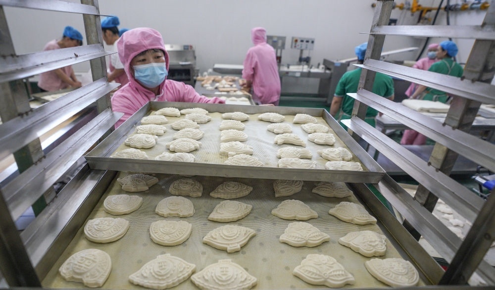 5月23日,工人在滄州渤海新區(qū)黃驊市河北銀海農(nóng)業(yè)科技有限公司面食生產(chǎn)車間搬運面花。新華社記者 駱學(xué)峰 攝