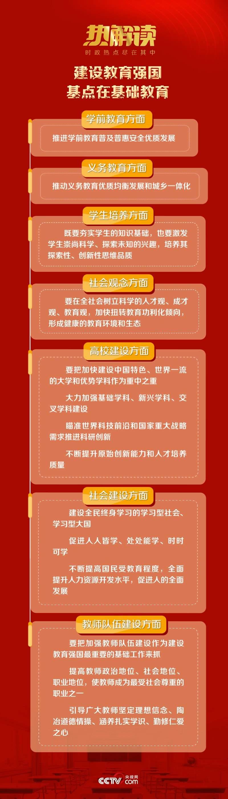 熱解讀5月29日下午,中共中央政治局就建設(shè)教育強(qiáng)國(guó)進(jìn)行第五次集體學(xué)習(xí)。習(xí)近平總書(shū)記在主持學(xué)習(xí)時(shí)強(qiáng)調(diào),要堅(jiān)持把高質(zhì)量發(fā)展作為各級(jí)各類(lèi)教育的生命線,加快建設(shè)高質(zhì)量教育體系。
