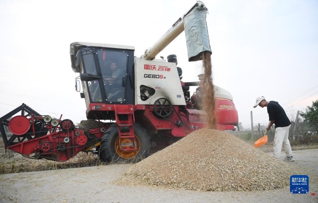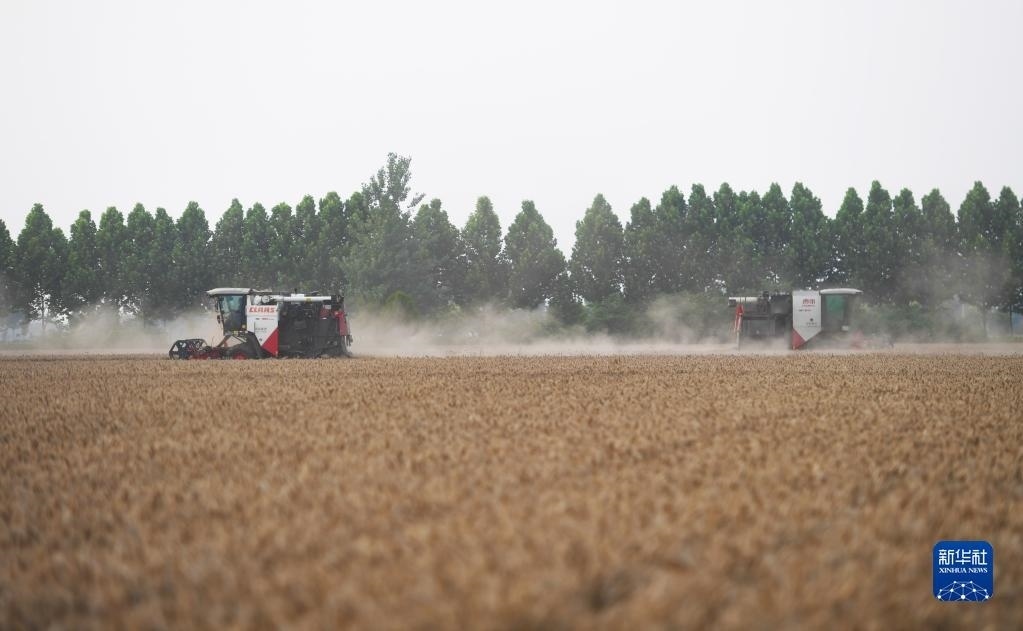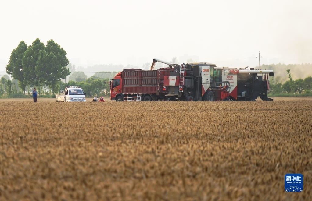 6月1日,在河南省駐馬店市上蔡縣邵店鎮(zhèn)劉岳村,收割機在搶收小麥。新華社記者 張浩然 攝