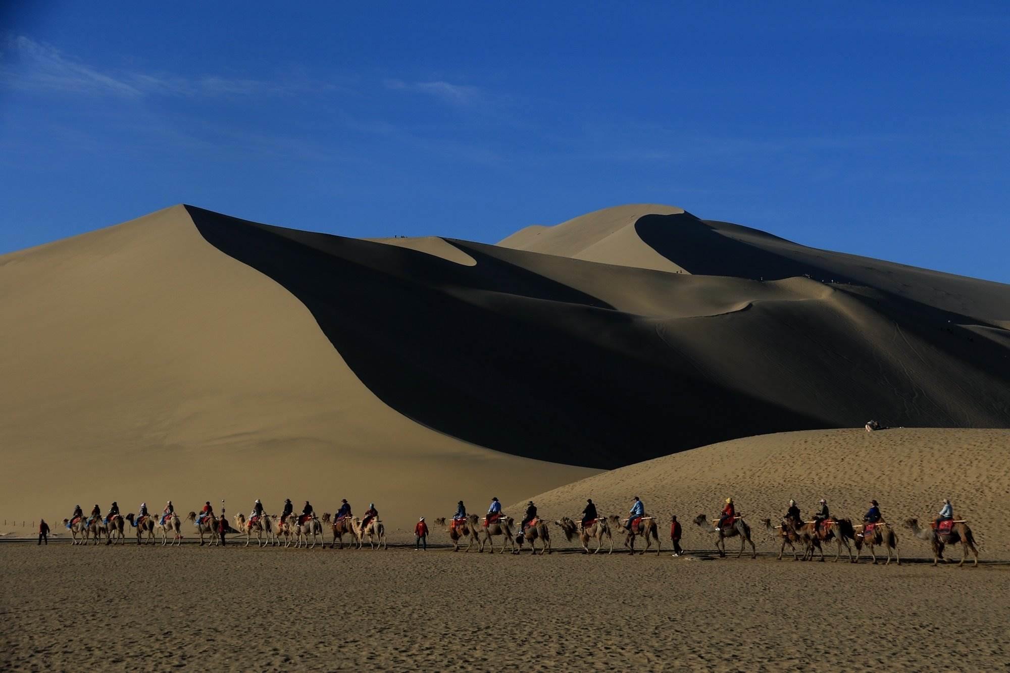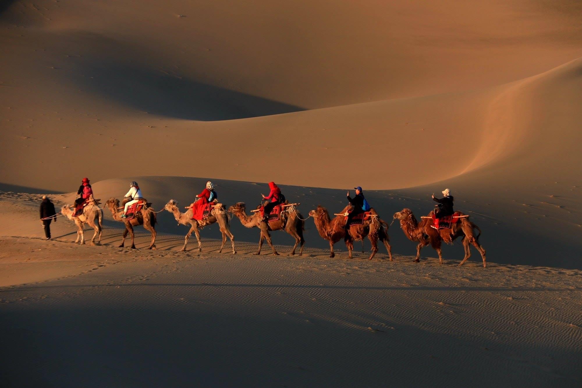 甘肅敦煌:游客騎駱駝?dòng)斡[鳴沙山