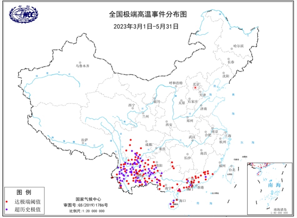 圖3 2023年春季全國極端高溫事件分布圖