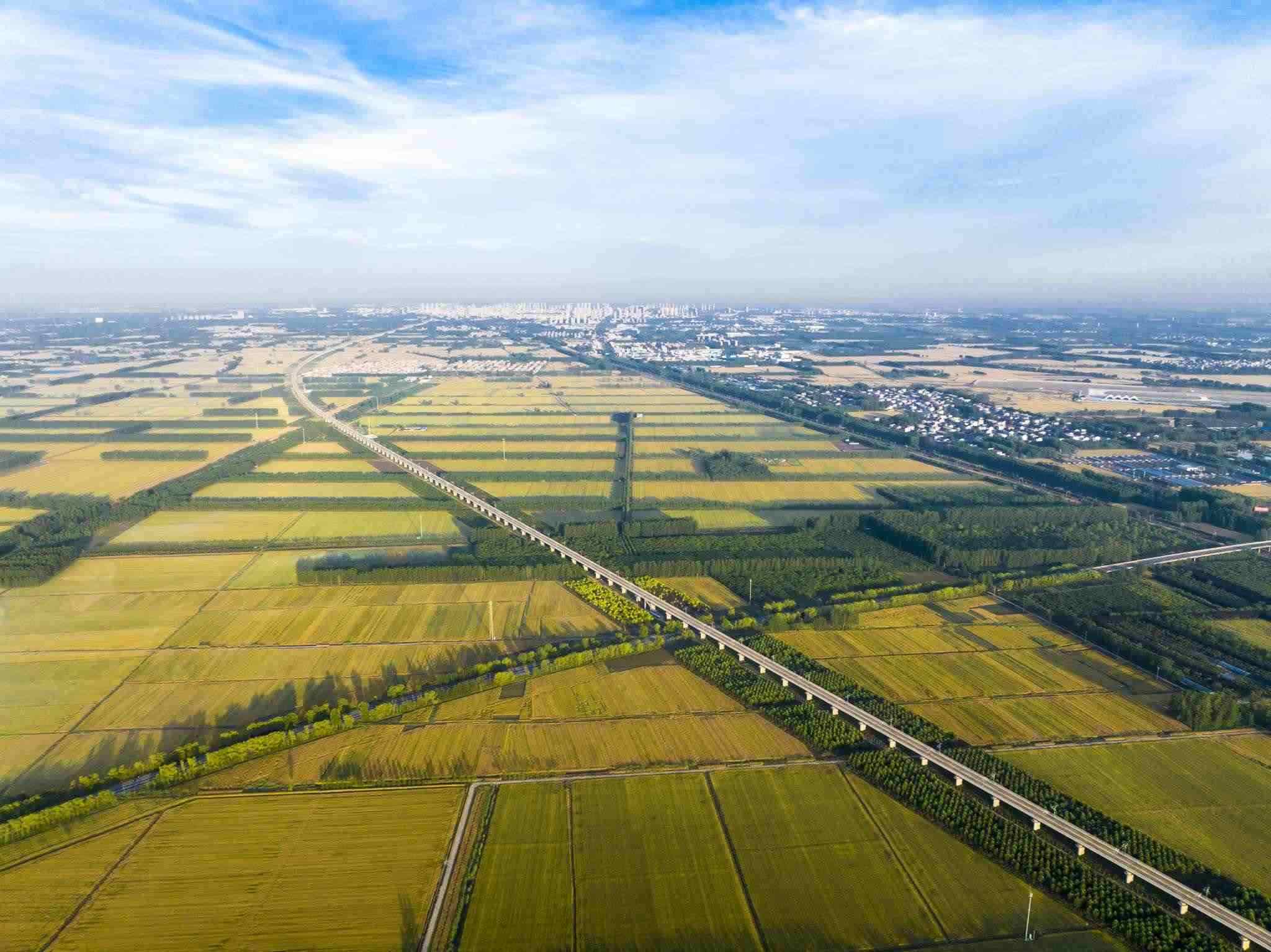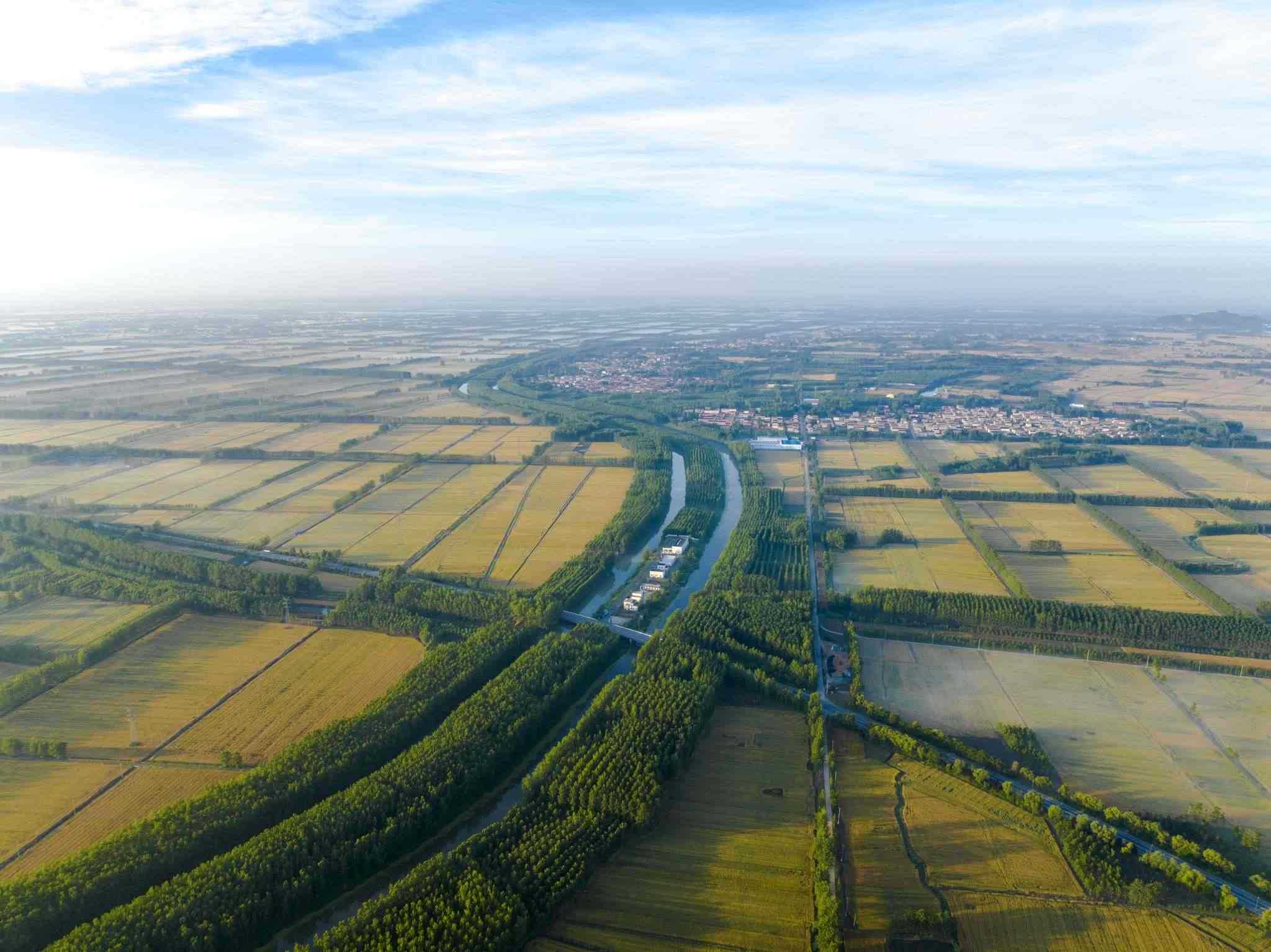 2023年6月3日,江蘇連云港,東??h,金色田野與村莊、道路、河流共同構(gòu)成了一幅秀美的夏日豐收畫卷。視覺中國