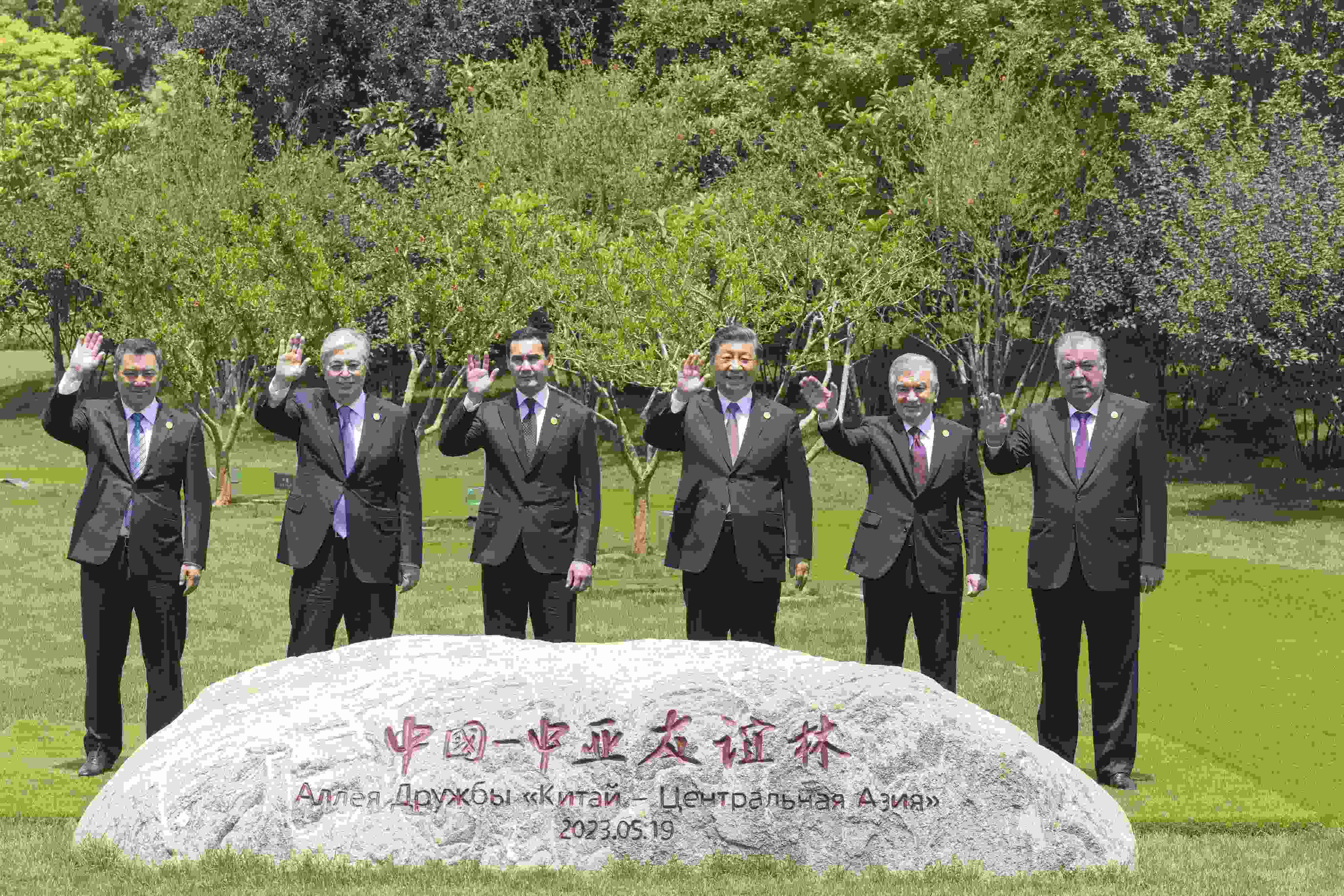 △5月19日上午,習(xí)近平主席在陜西省西安市主持首屆中國(guó)-中亞峰會(huì)并發(fā)表主旨講話。峰會(huì)結(jié)束后,習(xí)近平和中亞五國(guó)元首共同種下六棵石榴樹。