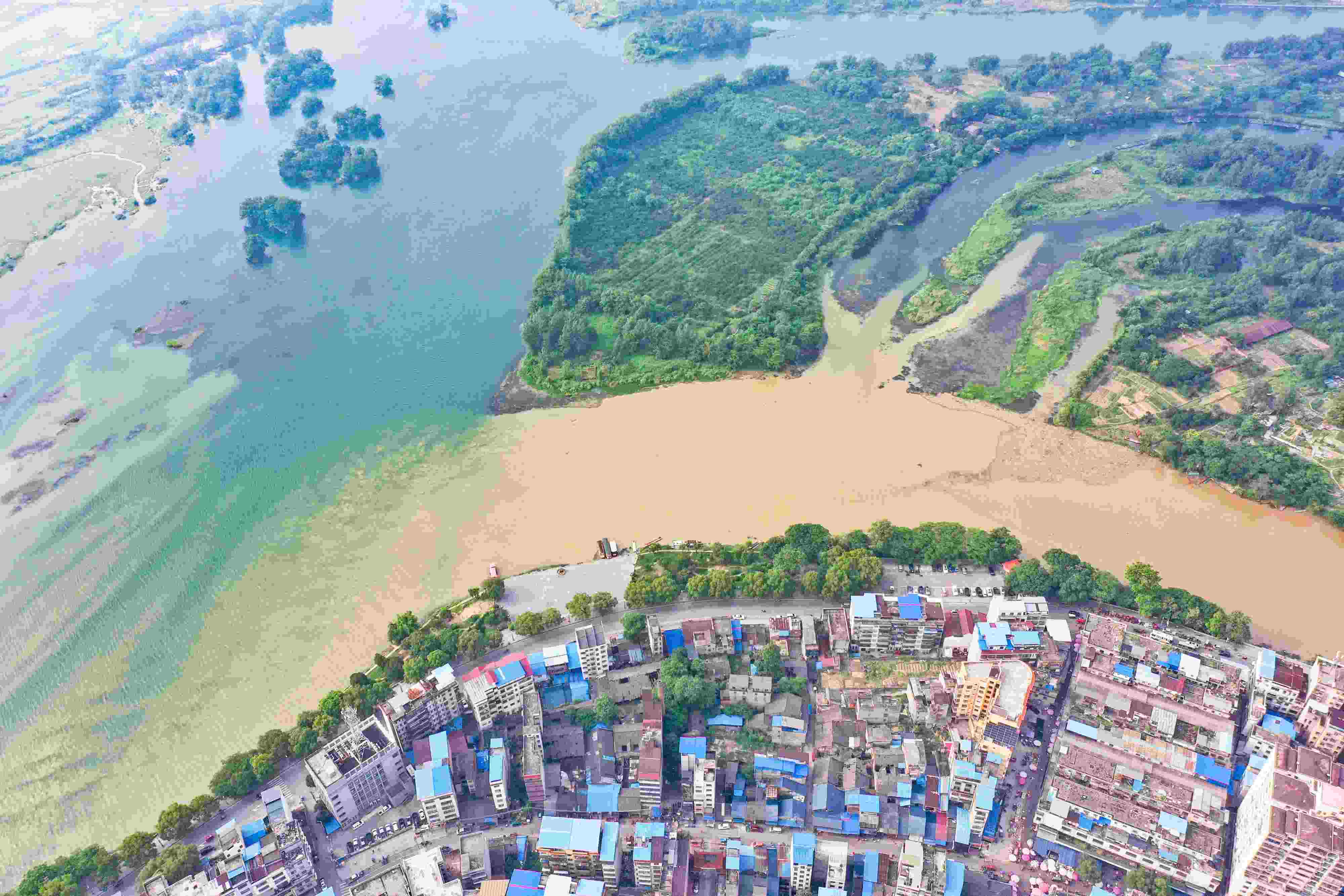 2023年6月4日,受降雨影響,廣西桂林全州縣城湘江河段出現(xiàn)涇渭分明景觀??罩懈╊娼Я魅f鄉(xiāng)河混濁的河水繞城匯入清澈的湘江干流,交匯之處涇渭分明。 視覺中國