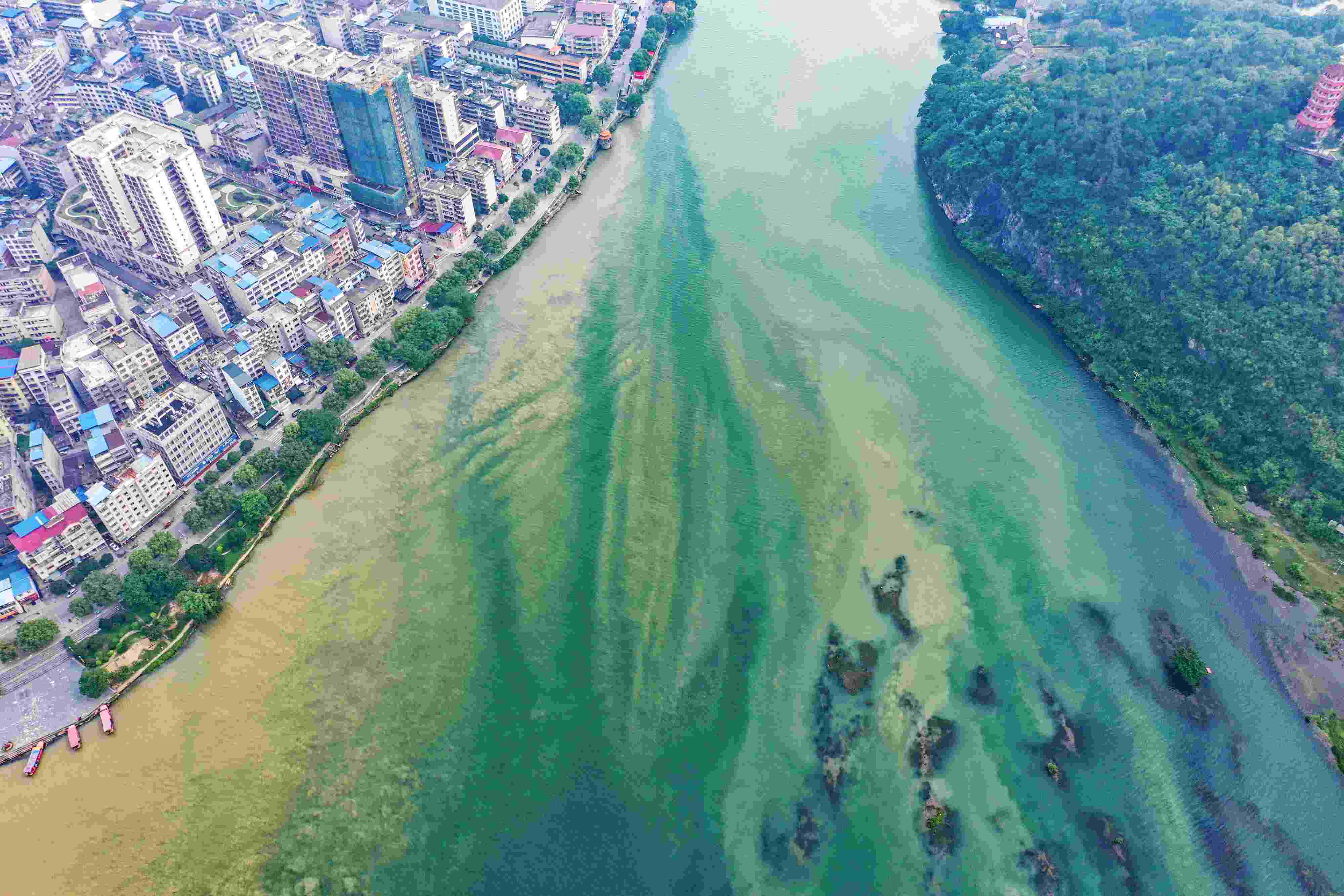 2023年6月4日,受降雨影響,廣西桂林全州縣城湘江河段出現(xiàn)涇渭分明景觀??罩懈╊?,湘江支流萬鄉(xiāng)河混濁的河水繞城匯入清澈的湘江干流,交匯之處涇渭分明。 視覺中國
