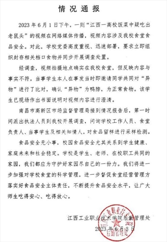 ·江西一學(xué)校食堂吃出“老鼠頭”?校方通報(bào):“異物”是鴨脖。