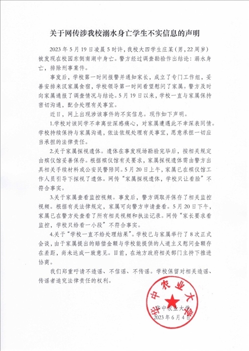 ·學(xué)生溺水身亡、不給家長(zhǎng)看監(jiān)控視頻?華中農(nóng)業(yè)大學(xué)回應(yīng):傳言不實(shí)。