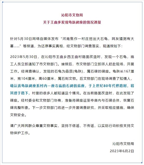 ·河南焦作一村莊修路挖出大石龜,沁陽(yáng)市文物局發(fā)布情況通報(bào):上世紀(jì)80年代修路時(shí)埋于路下。