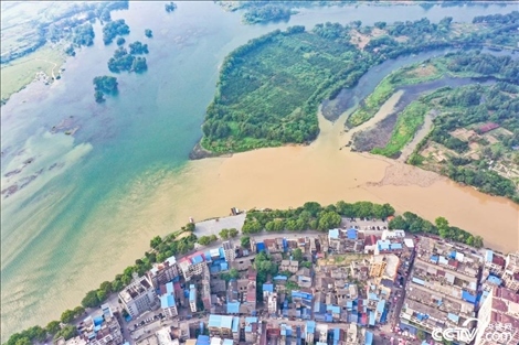 受降雨影響,廣西桂林全州縣城湘江河段出現(xiàn)涇渭分明景觀??罩懈╊?,湘江支流萬(wàn)鄉(xiāng)河混濁的河水繞城匯入清澈的湘江干流,交匯之處涇渭分明。
