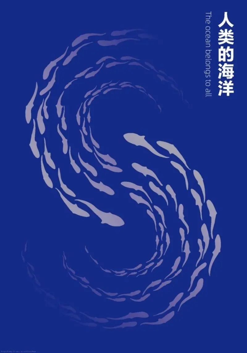 《人類的海洋》采用“S”形魚群為基本骨架,魚群錯(cuò)落交織游向海洋深處,寓意良好的海洋生態(tài)環(huán)境對(duì)魚群等海洋生物穩(wěn)定棲息的益處。造福于海洋,同時(shí)也是造福于人類。