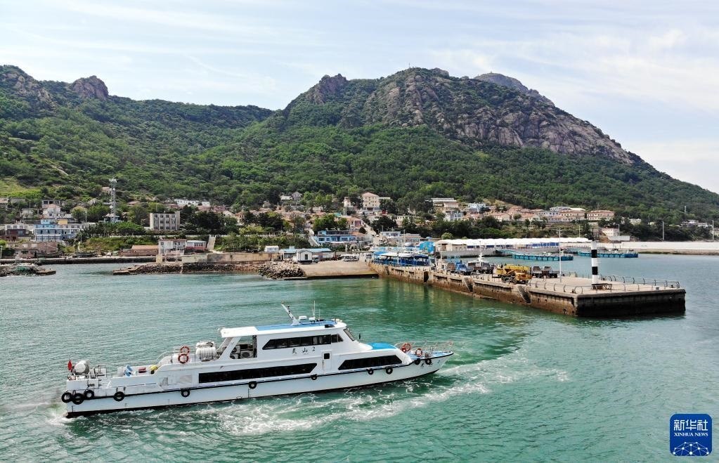 一艘快艇在靈山島省級自然保護(hù)區(qū)碼頭接送游客(6月5日攝,無人機(jī)照片)。