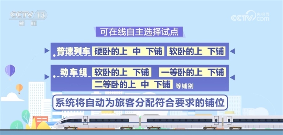 這次試行在線選鋪服務(wù)的230趟旅客列車,主要針對(duì)普速旅客列車和部分高鐵列車,涵蓋范圍包括普速列車的軟臥、硬臥和動(dòng)車組的軟臥、一等臥、二等臥等鋪別。同時(shí),繼續(xù)實(shí)行對(duì)60歲以上老人等重點(diǎn)旅客優(yōu)先分配下鋪的服務(wù)。