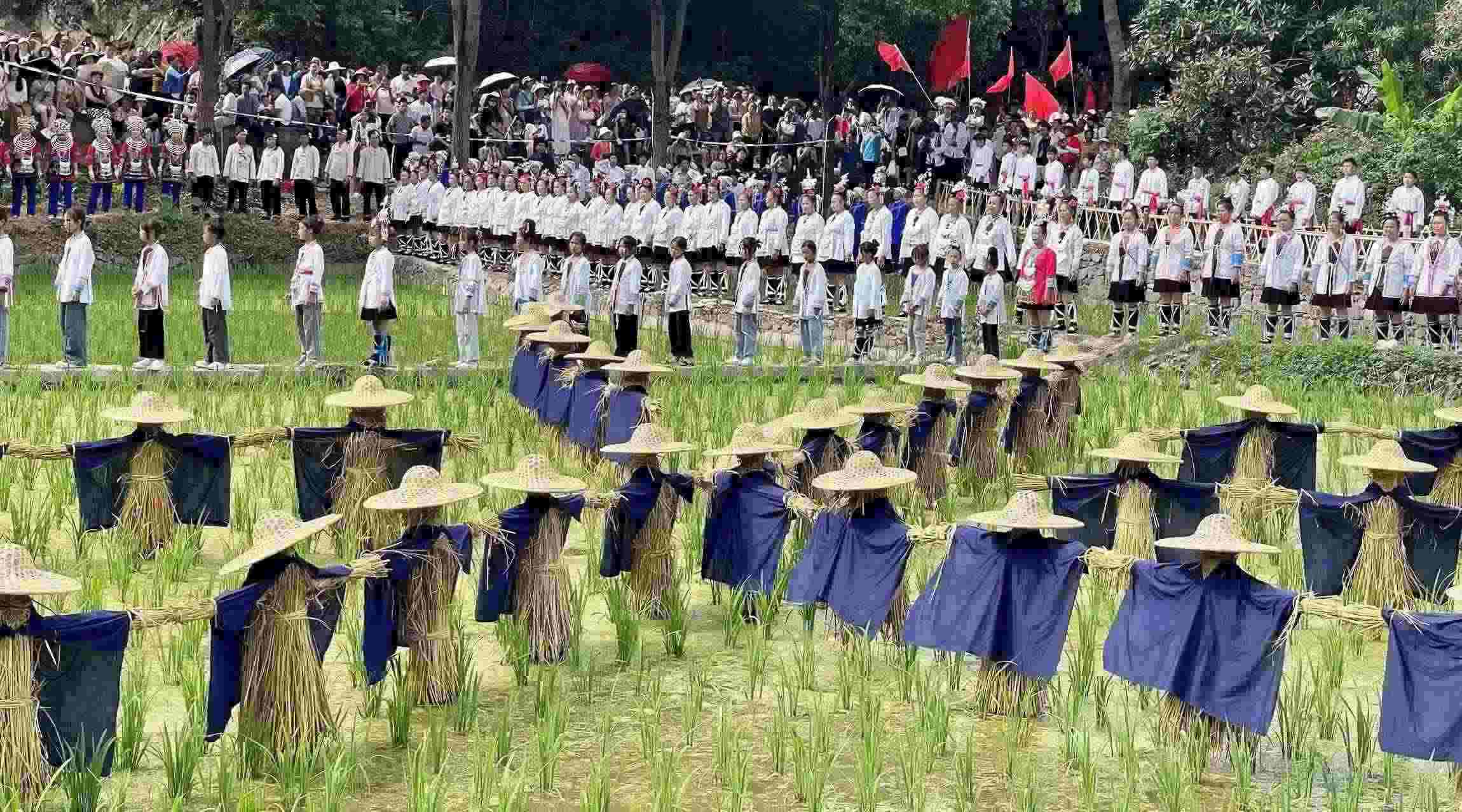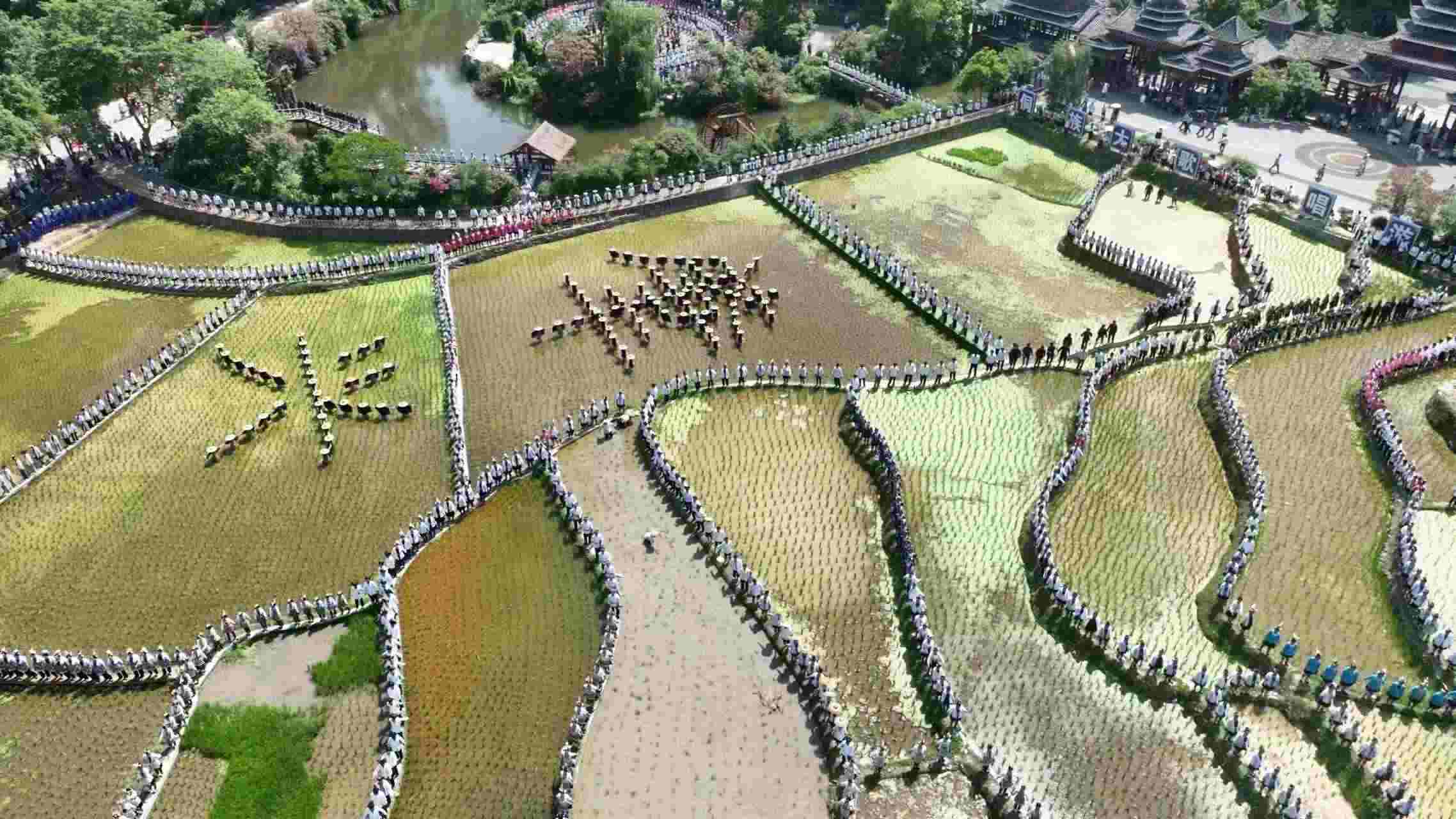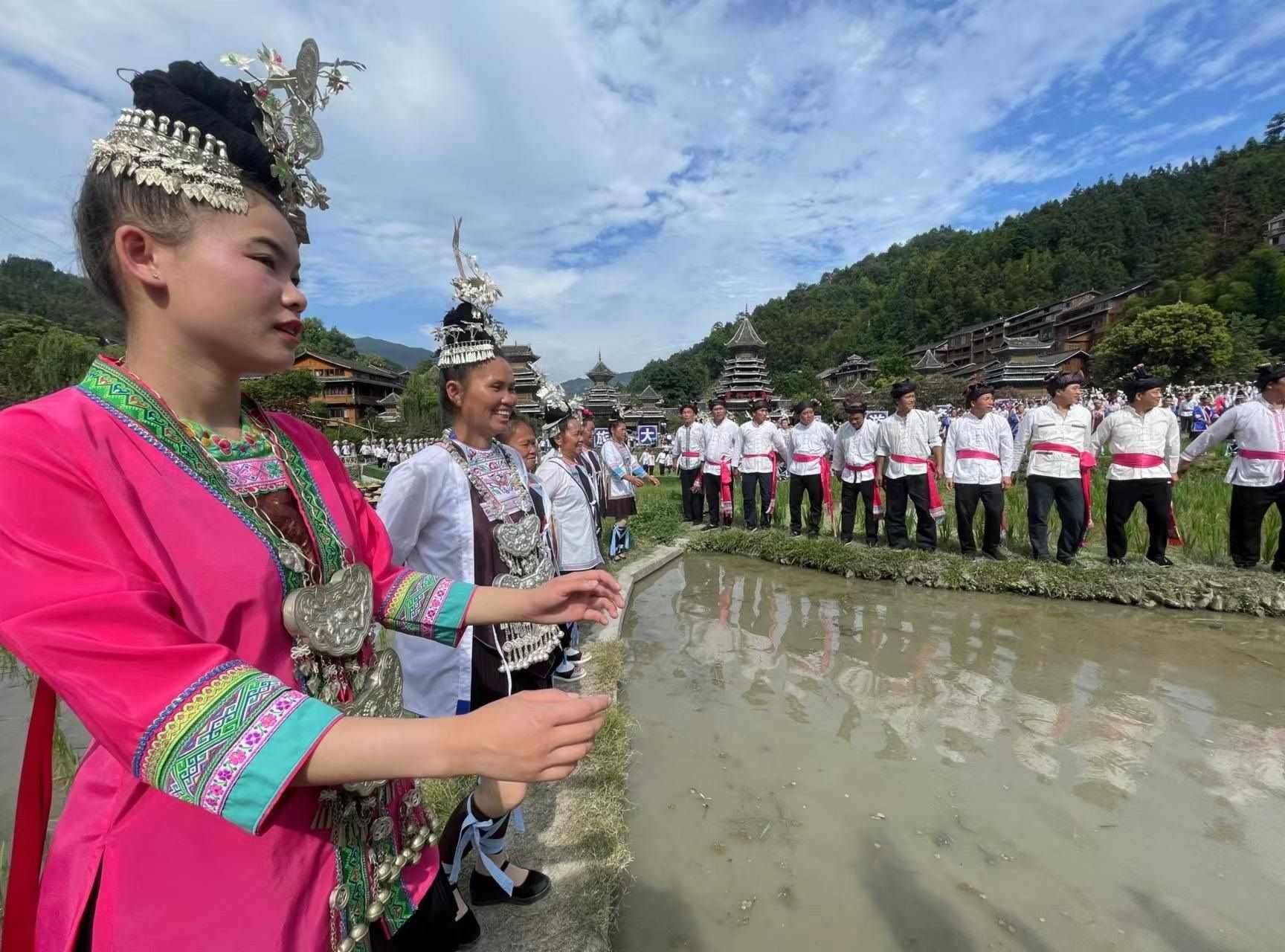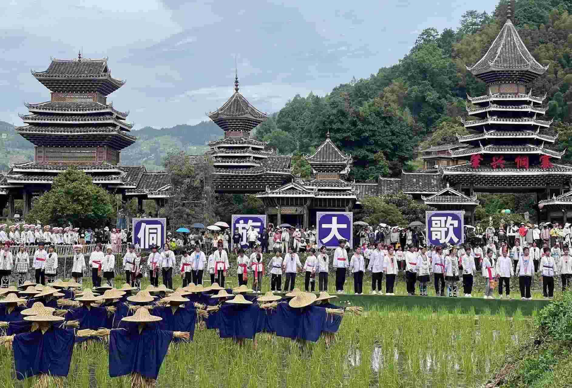 2023年6月10日,侗族同胞在貴州省黎平縣肇興侗寨田園實(shí)景展示侗族大歌。