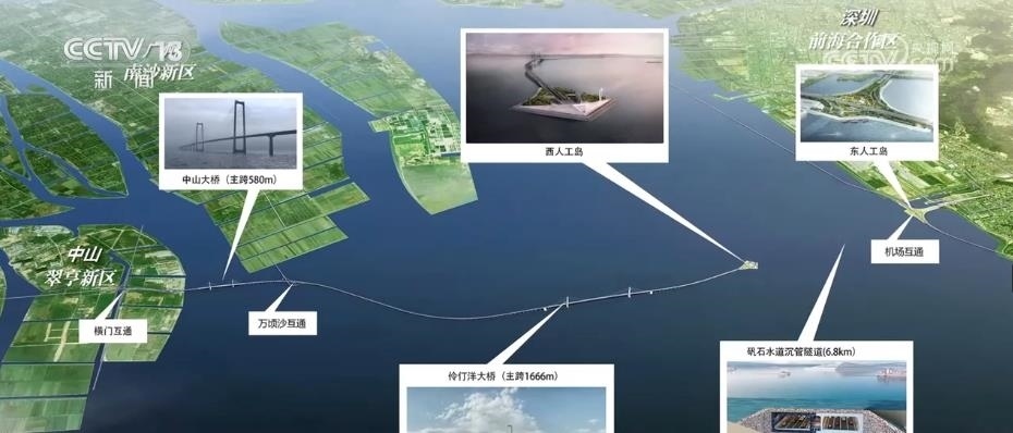 全長約24公里的深中通道橫跨珠江口,集“橋、島、隧、水下互通”于一體,關鍵控制性工程為伶仃洋大橋和海底沉管隧道,控制性工程包括中山大橋、東人工島、西人工島。