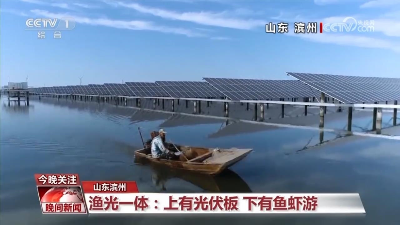 我們現(xiàn)在從陸地轉(zhuǎn)向水域,在山東濱州沾化的這個鹽田蝦養(yǎng)殖區(qū)里,蝦池上方是藍色光伏板,25度傾斜角的設(shè)計,既能達到最佳發(fā)電效果,又能為蝦池遮光、降溫。光伏矩陣下,漁民撐一葉小舟為蝦苗投喂餌料。每年,2000萬尾鹽田蝦從這里游上全國餐桌,近4億度清潔綠電并入電網(wǎng)。養(yǎng)殖業(yè)牽手新能源,奏出新時代的漁光曲。