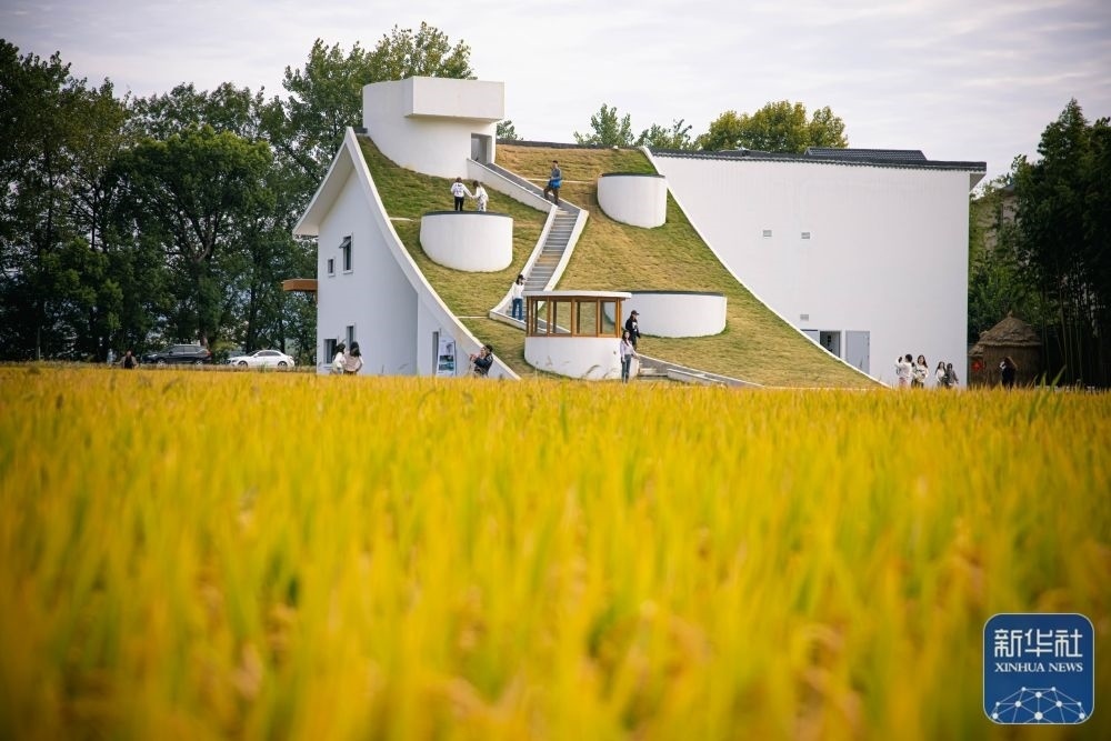 這是浙江杭州市桐廬縣桐君街道梅蓉村金黃的稻田與鄉(xiāng)村會(huì)客廳(2022年10月25日攝)。新華社記者 江漢 攝
