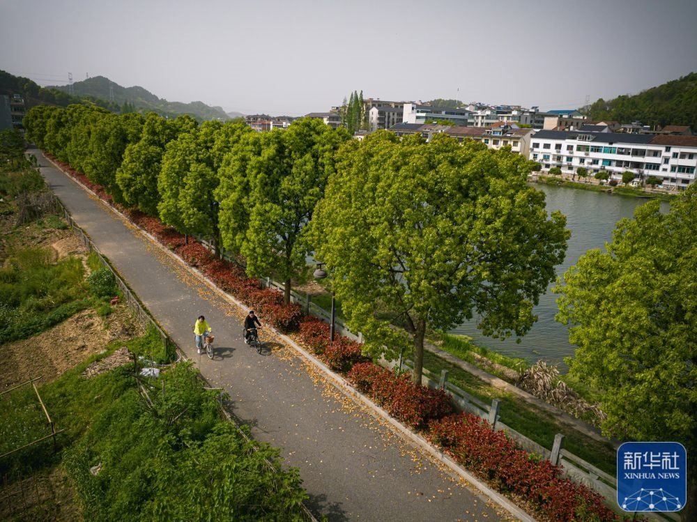 村民在浙江諸暨市暨南街道街亭村開化江畔的綠道上騎行(4月12日攝,無(wú)人機(jī)照片)。新華社記者 江漢 攝