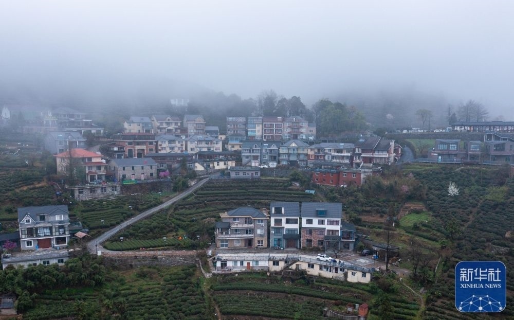空中俯瞰云霧中的浙江杭州富陽(yáng)里山鎮(zhèn)安頂村(3月23日攝,無(wú)人機(jī)照片)。安頂村海拔700多米,一年中有200多天可觀賞“安頂云?!逼婢?,當(dāng)?shù)匕傩找劳懈呱皆旗F茶以及特色鄉(xiāng)村旅游產(chǎn)業(yè),走出了一條茶旅融合的新農(nóng)村共同富裕發(fā)展模式。新華社記者 徐昱 攝