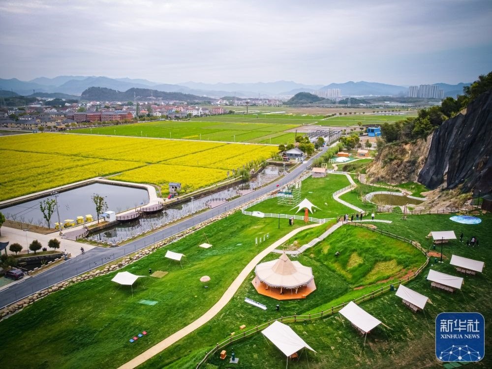 這是3月29日拍攝的浙江諸暨市楓橋鎮(zhèn)杜黃新村用廢棄礦山改造的露營(yíng)旅游地(無(wú)人機(jī)照片)。新華社記者 江漢 攝