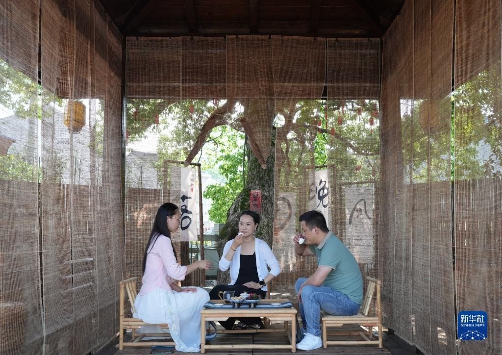 人們在浙江臺州黃巖區(qū)嶼頭鄉(xiāng)布袋坑村的溪水旁喝茶(5月30日攝)。近年來,嶼頭鄉(xiāng)堅持黨建引領(lǐng),以全域旅游和美麗鄉(xiāng)村建設(shè)為重要抓手,引進文化創(chuàng)意團隊,為鄉(xiāng)村旅游注入更加年輕化的元素,推進特色民宿以及布袋山饅頭、溪坑魚等農(nóng)特產(chǎn)品的發(fā)展,帶動鄉(xiāng)村振興和百姓共富。新華社記者 徐昱 攝