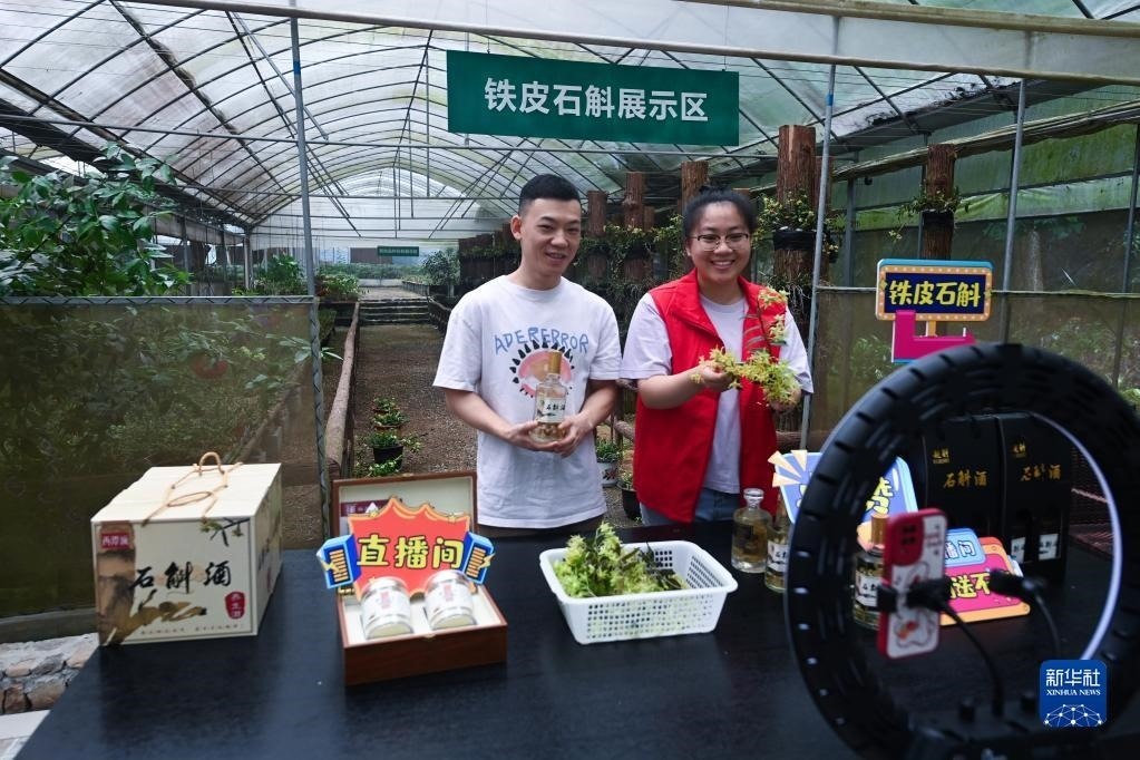 在浙江諸暨東白湖鎮(zhèn)的鐵皮石斛有機種植基地,東白湖鎮(zhèn)黨員志愿者(右)和基地負責人一起直播銷售鐵皮石斛花茶、鐵皮石斛酒等產(chǎn)品(6月8日攝)。近年來,東白湖鎮(zhèn)著力發(fā)展鐵皮石斛等特色農(nóng)業(yè)產(chǎn)業(yè),加快農(nóng)業(yè)數(shù)字化轉(zhuǎn)型,推進農(nóng)特產(chǎn)品交易服務(wù)中心、惠農(nóng)綜合平臺以及直播經(jīng)濟的發(fā)展。新華社記者 徐昱 攝