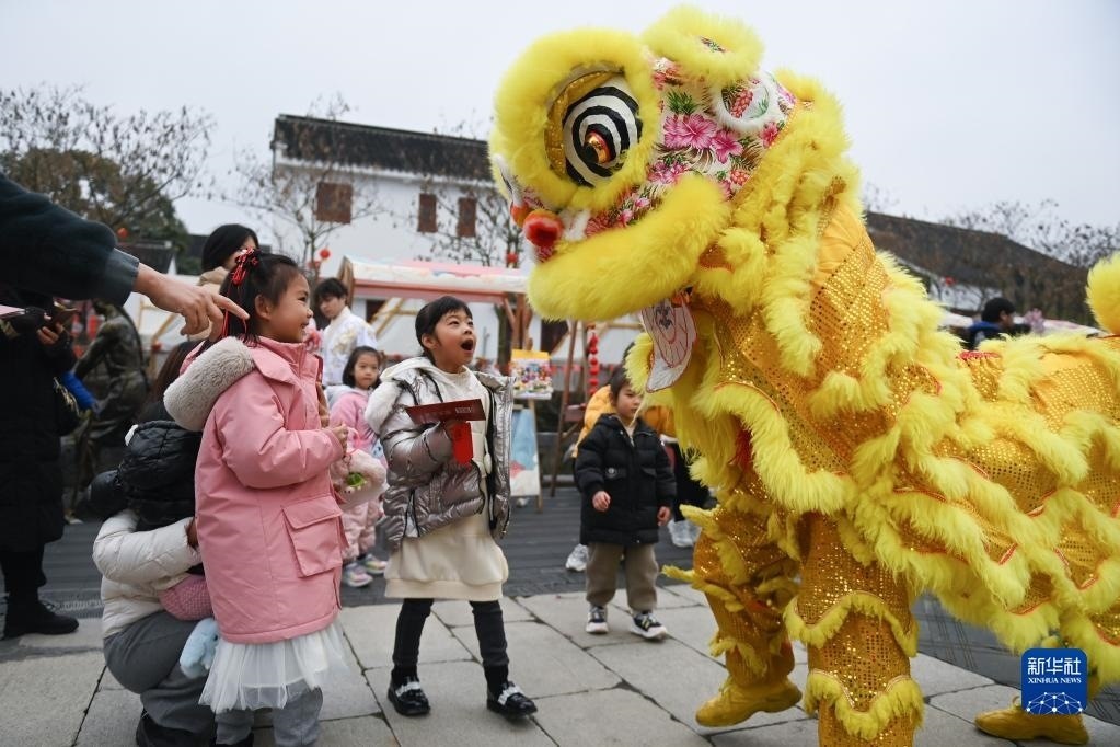 游客在浙江湖州吳興區(qū)八里店鎮(zhèn)潞村觀看舞獅表演(2月5日攝)。新華社記者 黃宗治 攝