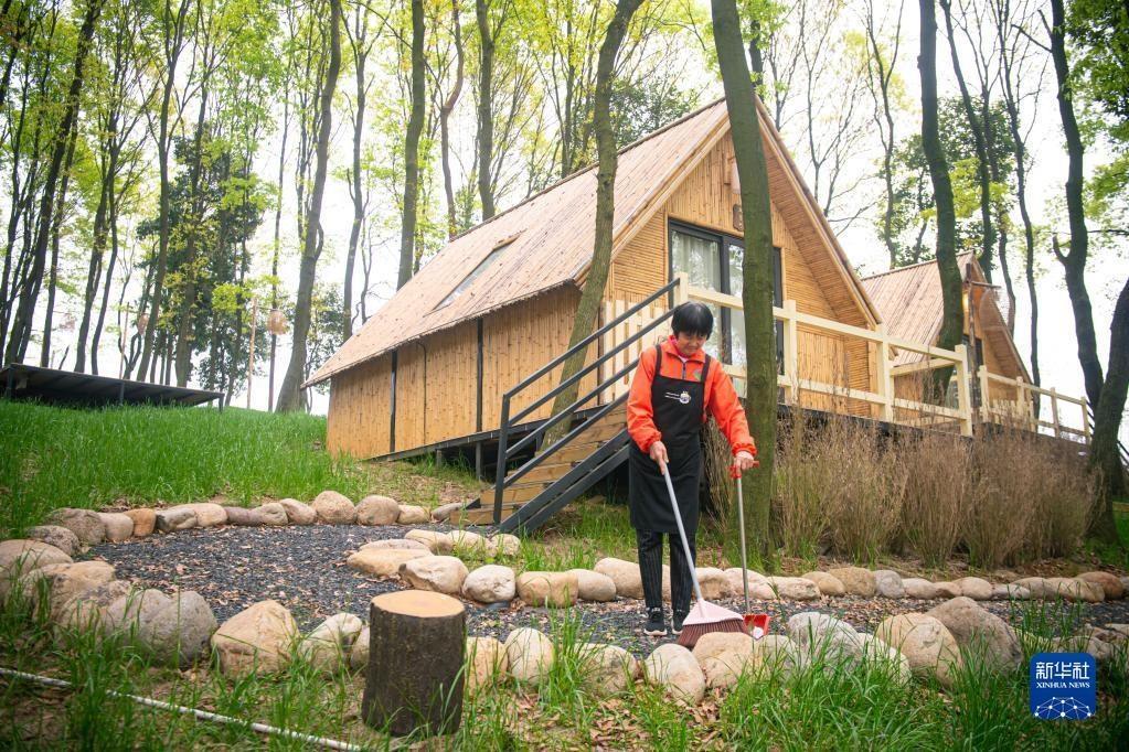 浙江諸暨楓橋鎮(zhèn)陽春村村民在一家度假村內(nèi)工作(3月29日攝)。當?shù)赝ㄟ^閑置荒山土地流轉(zhuǎn)發(fā)展鄉(xiāng)村旅游,幫助陽春村60名村民實現(xiàn)在家門口就業(yè)增收。新華社記者 黃宗治 攝