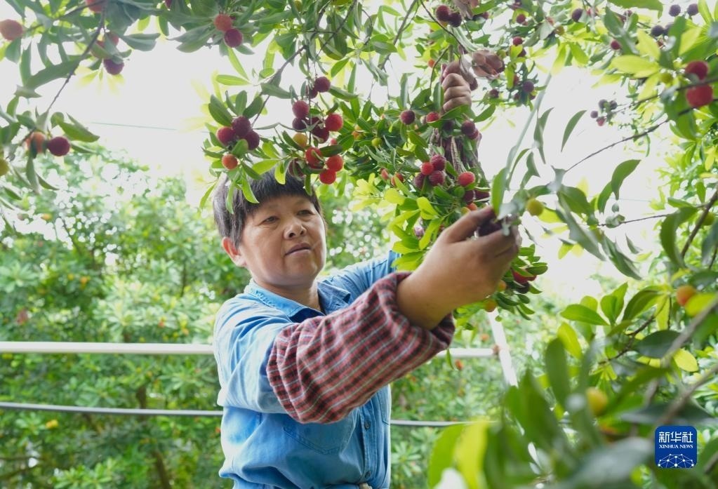 在浙江余姚三七市鎮(zhèn),果農(nóng)陳利平在采摘楊梅(6月1日攝)。她和丈夫鄭通海在承包的楊梅山上建起保溫大棚,上市時間比露天楊梅提前不少。新華社記者 翁忻旸 攝