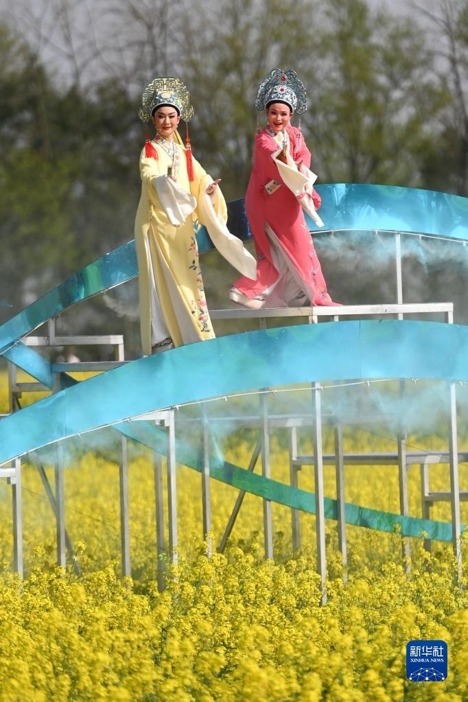 越劇演員在浙江桐廬梅蓉村油菜花田里的舞臺上表演(3月26日攝)。新華社記者 黃宗治 攝