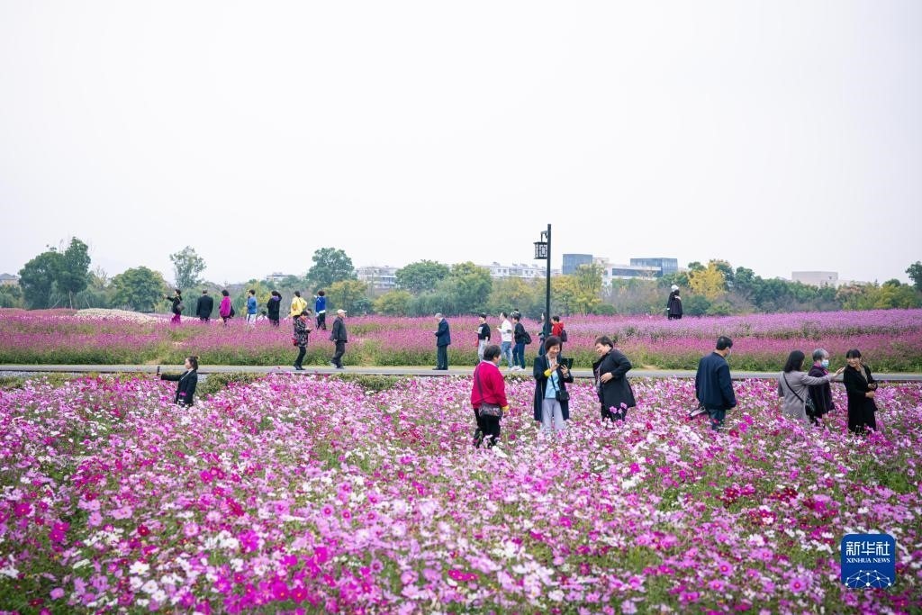 游客在浙江杭州余杭區(qū)徑山鎮(zhèn)游玩賞花(2022年10月28日攝)。新華社記者 江漢 攝