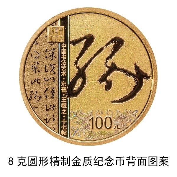 8克圓形金質紀念幣背面圖案為東晉王羲之書《十七帖》局部文字及“緣”字樣與裝飾紋樣、“中國書法藝術”篆刻鈐印等組合設計,并刊“中國書法藝術·東晉·王羲之·十七帖”字樣及面額。