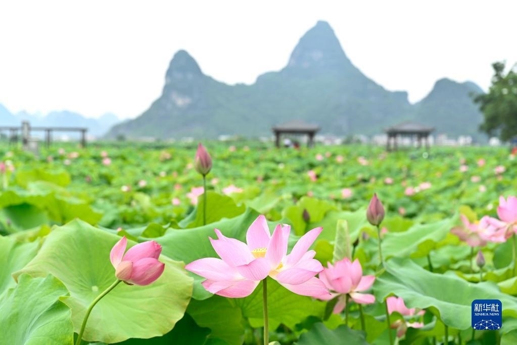 時下,廣西柳州市柳江區(qū)百朋鎮(zhèn)萬畝荷塘里的各色荷花競相綻放,吸引游客前來賞花游玩。新華社發(fā)(黎寒池 攝)