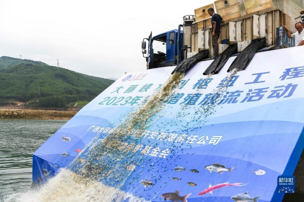 6月15日,在廣西大藤峽水利樞紐工程,工作人員在放魚苗。