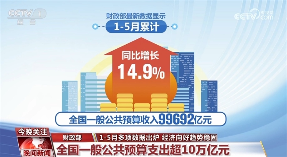 財政部最新數(shù)據(jù)顯示,1—5月累計,全國一般公共預算收入99692億元,同比增長14.9%;全國一般公共預算支出104821億元,同比增長5.8%。教育、科學技術(shù)、社會保障和就業(yè)、衛(wèi)生健康等支出,同比增長均超過5%。