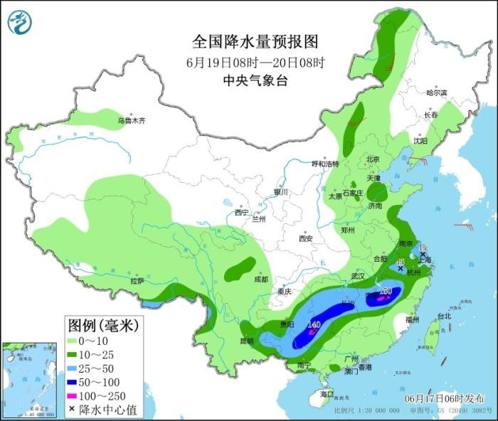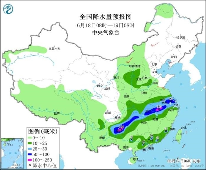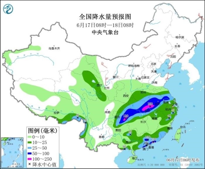 17日至19日,西南地區(qū)東部、江漢、江淮、江南、華南等地有大范圍較強(qiáng)降雨過程,部分地區(qū)有大到暴雨,局地大暴雨,并伴有短時(shí)強(qiáng)降水、雷暴大風(fēng)等強(qiáng)對流天氣。其中,6月17日08時(shí)至18日08時(shí),江淮大部、江漢大部、湖南北部、重慶中東部、貴州北部、廣西北部和南部沿海、廣東中南部、福建南部以及西藏東南部、云南西北部等地部分地區(qū)有大到暴雨,其中,湖北東部、重慶東南部、貴州東北部、廣東中南部等地部分地區(qū)有大暴雨(100~150毫米)。上述部分地區(qū)伴有短時(shí)強(qiáng)降水(最大小時(shí)降雨量20~60毫米,局地可超過70毫米),局地有雷暴大風(fēng)等強(qiáng)對流天氣。中央氣象臺6月17日06時(shí)繼續(xù)發(fā)布暴雨藍(lán)色預(yù)警。