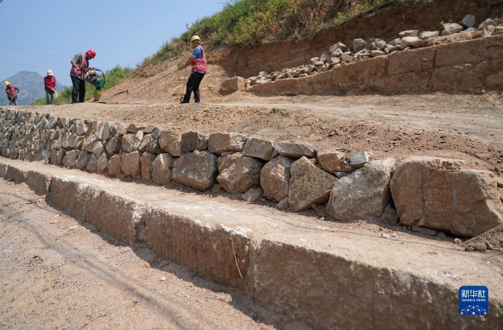 6月16日,工人在山海關(guān)長(zhǎng)城51號(hào)墻臺(tái)馬道修繕工地施工。