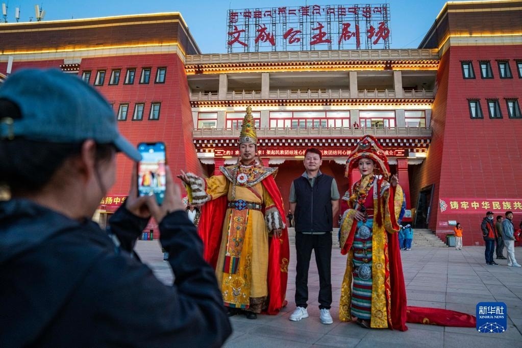 游客在文成公主劇場前和演員合影留念(6月6日攝)。