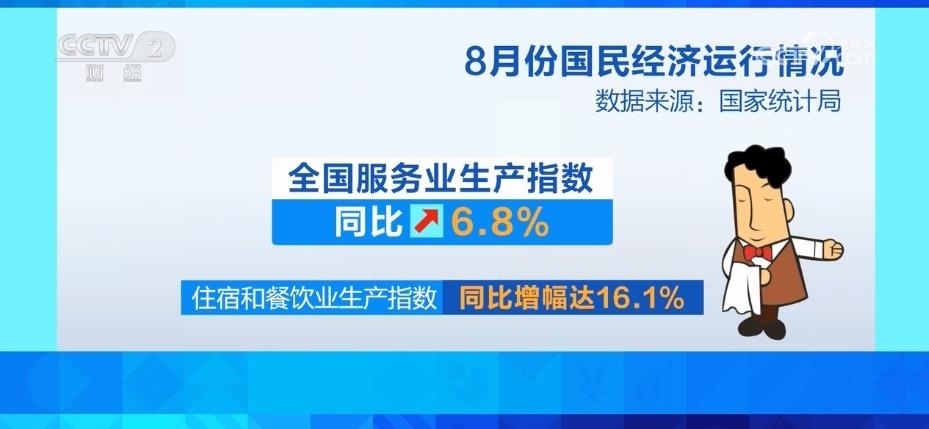 服務(wù)業(yè)較快增長(zhǎng),8月份,全國(guó)服務(wù)業(yè)生產(chǎn)指數(shù)同比增長(zhǎng)6.8%。其中,住宿和餐飲業(yè)依然保持較快增長(zhǎng),生產(chǎn)指數(shù)同比增幅達(dá)到16.1%。