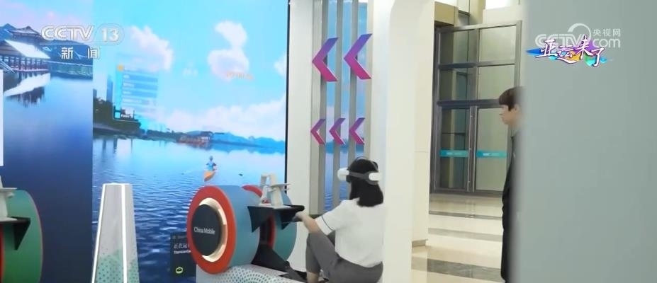 在5G和實時云渲染技術(shù)的支持下,配合劃船機和VR眼鏡,在主媒體中心就能實現(xiàn)“泛舟西湖”,沉浸式觀賞晴天、雨天等不同天氣情況下,西湖從斷橋到雷峰塔的沿湖美景。并列的兩臺劃船機還可以聯(lián)機比賽,讓體驗者在西湖美景中享受運動和VR競技帶來的樂趣。