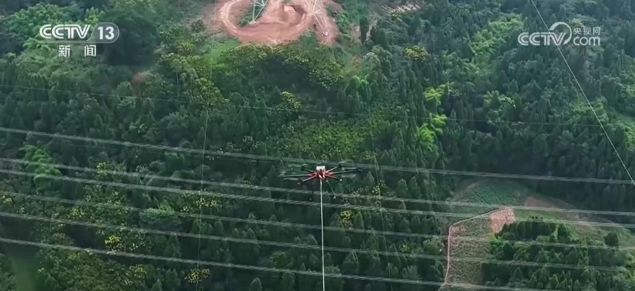 在施工現(xiàn)場(chǎng),工作人員操作無人機(jī),帶著牽引繩緩緩升空,在140米的高空,帶動(dòng)重量達(dá)到6噸的導(dǎo)線,緩緩跨過500千伏嘉林線上空,最終架設(shè)在兩基170多米高、間距400米的鐵塔間。