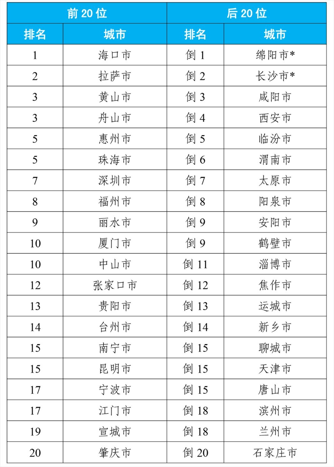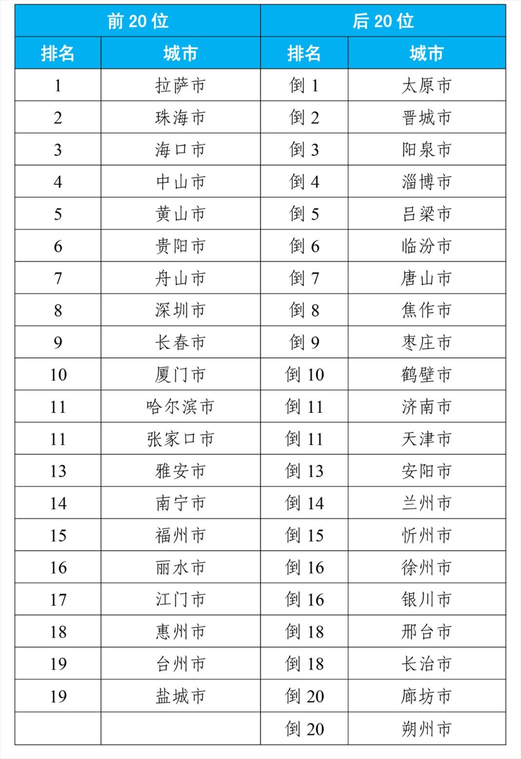 8月,168個(gè)重點(diǎn)城市中,空氣質(zhì)量排名前20位城市依次是拉薩、珠海和??诘瘸鞘校◤牡?名至并列第19名);空氣質(zhì)量排名后20位城市依次是太原、晉城和陽泉等城市(從倒數(shù)第1名至并列倒數(shù)第20名)。見附表1。