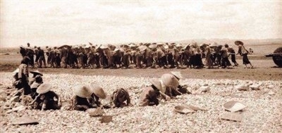 △抗戰(zhàn)期間,中國(guó)民工手搬石塊、肩拉石碾修筑機(jī)場(chǎng)。(資料圖片)