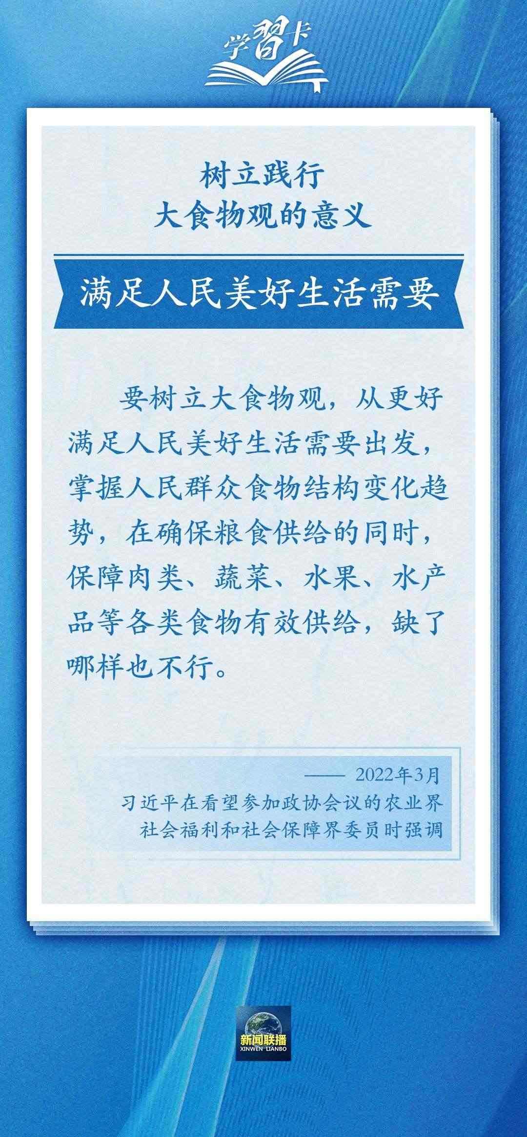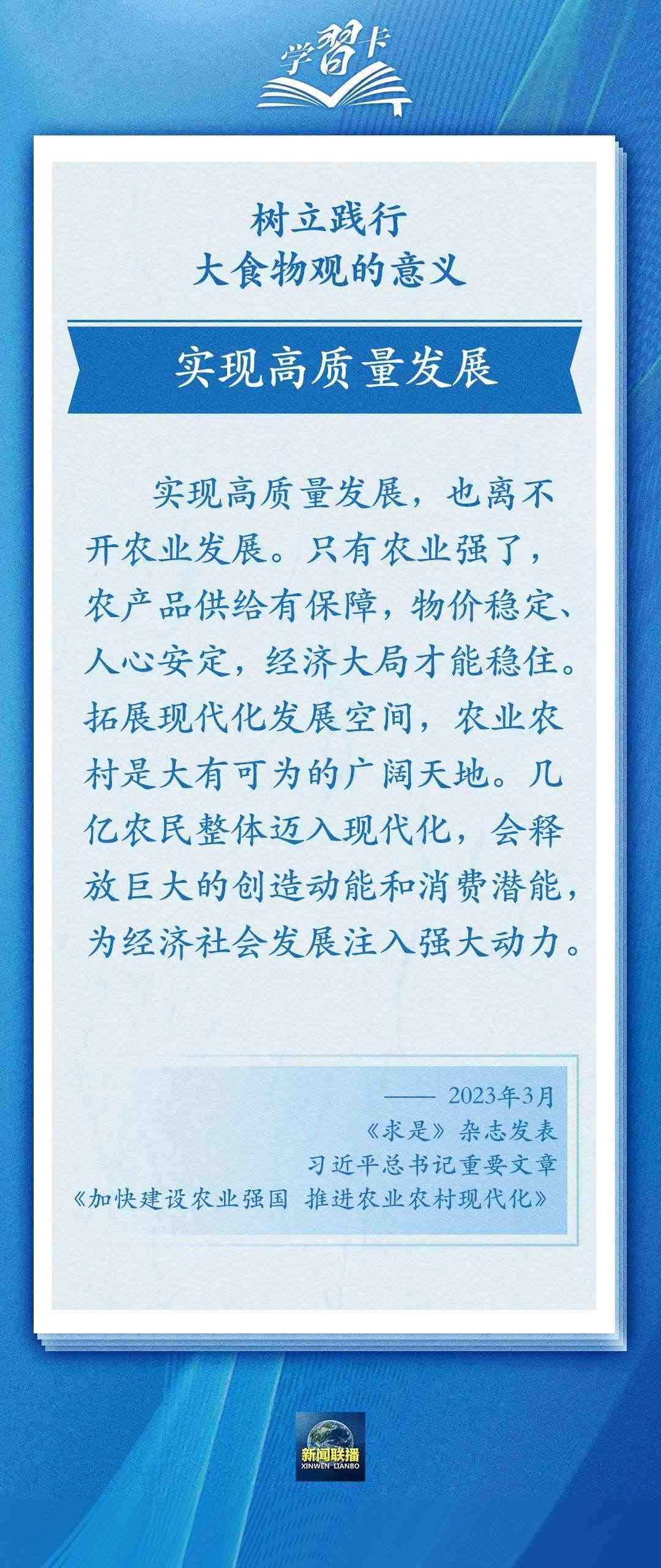 今年4月,總書記在廣東湛江考察時指出,要樹立大食物觀,既向陸地要食物,也向海洋要食物。前不久,總書記主持召開新時代推動東北全面振興座談會強調(diào),踐行大食物觀,把農(nóng)業(yè)建成大產(chǎn)業(yè)。