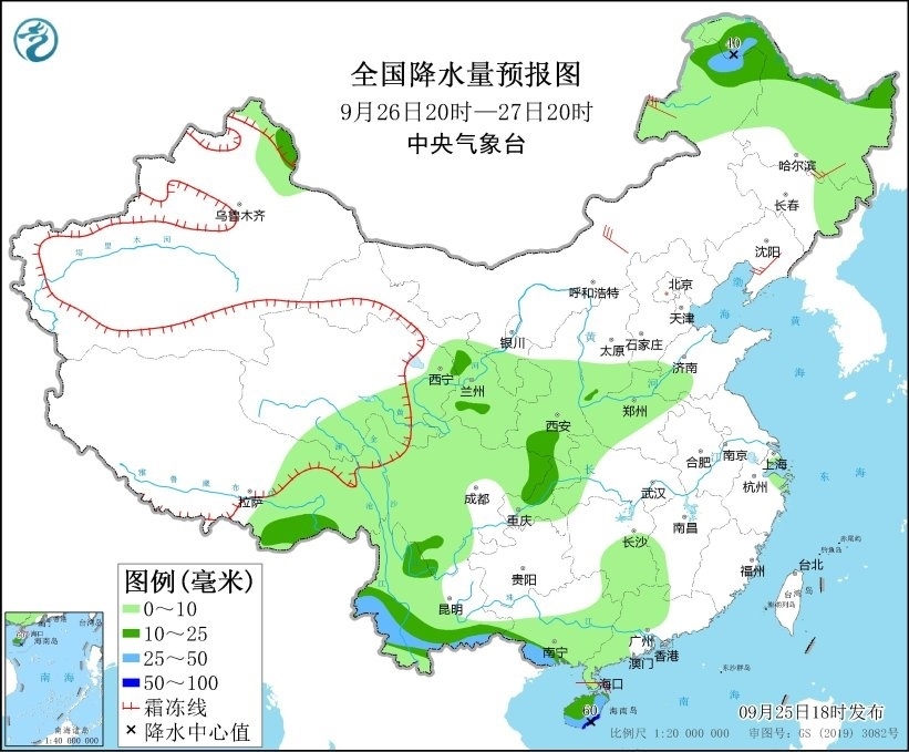 9月25日20時(shí)至26日20時(shí),廣東西南部、廣西南部、海南島以及新疆北疆北部、西藏東南部、陜西南部等地部分地區(qū)有中到大雨,其中,海南島東部和南部等地部分地區(qū)有暴雨或大暴雨(100~180毫米)。另外,新疆阿勒泰山區(qū)有雨夾雪或雪。內(nèi)蒙古中西部、山東半島等地部分地區(qū)有4~6級風(fēng)(見圖1)。